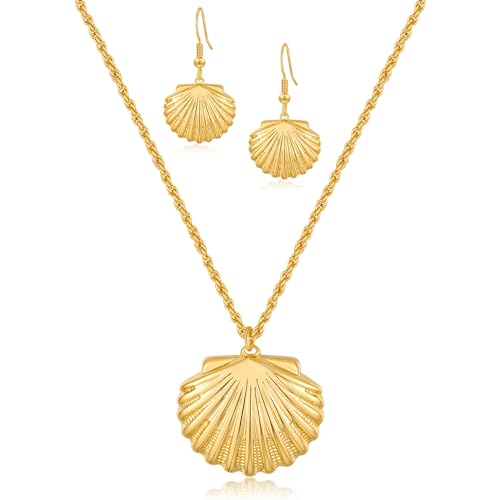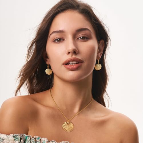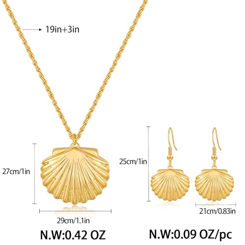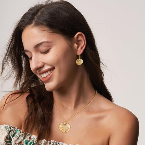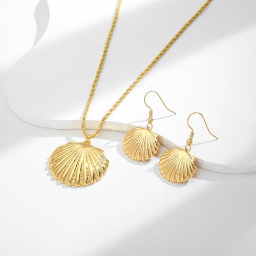 FAUTHENTICUTE Gold Shell Jewelry Set Beach Shell Necklaces For Women Shell Drop Dangle Earrings Perfect summer jewelry gift for beach lovers Necklace Length: 19+3 inches, Earring Size: 25*21mm Lightweight design for comfortable wear Crafted from high-quality copper for durability and shine Features intricately detailed shell motifs for a beach-inspired look Versatile set suitable for both casual outings and special occasions